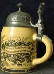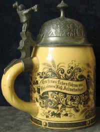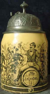 This great PUG (printed under glaze) stein is an advertisement for Salvator Beer and shows a happy student astride a 200 liter barrel of Salvator Beer. The stein is marked with the logo of Paul Utzschneider of Saarguemines which was associated with V&B at Mettlach in the mid 1800's and made very similar quality steins, ca. 1900. | |