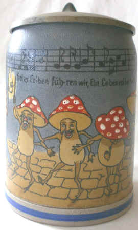 The verse was written in 1782 by Friedrich von Schiller (1759 to 1805) one of the great German men of literature and put to the music of Gaudeamus Igitur using a comical scene with mushrooms singing reminiscent of Heinrich Schlitt on this salt-glazed, stoneware stein, ca. early 1900's. | |