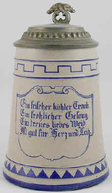 What more could one ask for represented by this verse on a Jugendstil (youth style = modern art), salt-glazed, stoneware stein in the manner of August Sältzer of Eisenach, ca. early 1900's. | |