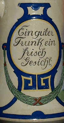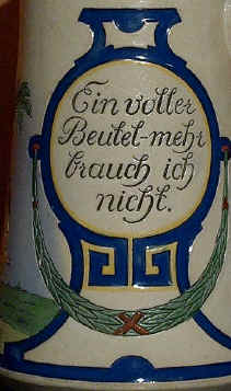 What more does one need than this? This is a handsome etched Jugendstil (youth style = modern art) stein featuring a Münchner Kindl (Munich Child - symbol of the city of Munich) on a barrel and marked "1868" ca. early 1900's. | |