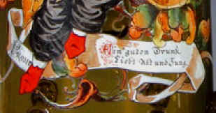 | The verse is self-explanatory on this large, glass pouring stein with a transfer and hand painted scene of the Münchner Kindl (Munich Child) which is the symbol of the city of Munich and a Prosit (Cheers) from Latin "Pro sit" (for health), ca. 1900. | |