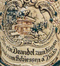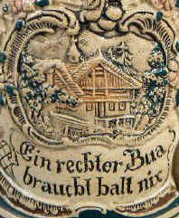 Oh those Bavarian men are really something as noted in Bayrisch (Bavarian dialect) on this relief stein marked with the Thewalt logo and "90 B", ca. 1890's. | |