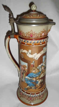 | Drinking the right drink at the right time can be a good thing as proclaimed on this tall etched pouring stein marked with the Mettlach logo and form number 2206 and dated 1898. | |