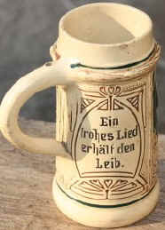 Here's a self explanatory verse with many cognates on this small, stein without lid and with Jugendstil (youth style = modern art) elements marked "Germany 436/2", ca. early 1900's. | |