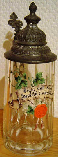 This is a faceted, glass stein with an enameled verse of a patriotic German's motto, ca. 1900. | |