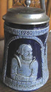 The saying on this stein is quoted from Goethe's play entitled "Götz von Berlichingen" whose name became a euphemism for this saying. Also known as "Götz of the Iron Hand", he was a real German Knight who was very head strong, fought many battles and gained an infamous reputation. The saying came from his resistance to a siege at his castle at Jagthausen where he died at age 82. The stein was made for the 500-year Jubilee of his birth in 1480 and is dated 1980. | |