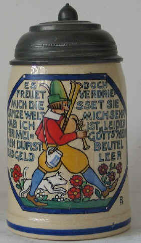 His designs are the most collectable among the beer stein and Jugendstil collectors. The decorations show a typical Ringer character - it shows in many of his designs - nicknamed "Yellow pants", playing bagpipes on the go. A beer stein is hanging from his shoulder. | |