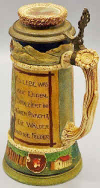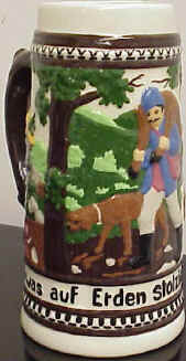 This comical porcelain inlay on a glass stein, ca. late 1800's, bodes for a happy life for everything on the earth that is exuberant and proud. The text is from an 1822 song written by German lyric poet Wilhelm Müller (1794 -1827). The words "Tracht" (dress) and "Pracht" (splendor), as seen in the modern, ca. post WWII, stein below, have been used interchangeably over time. One archaic meaning of the word "Jagd" is hounds, and the hounds pictured on the inlay could be an indication that this was the intended meaning here. | |