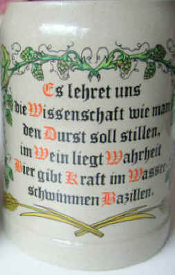 Here are more good reasons to drink only beer and wine on this modern stein (without lid) marked "Western Germany", ca. post WWII. | |
