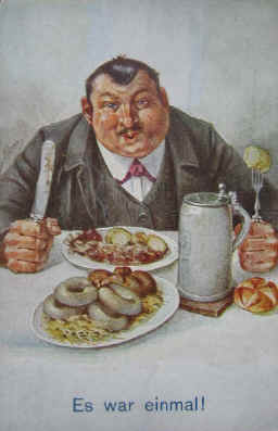 This verse is the beginning of an old German folksong: "Es war einmal ein treuer Hußar!" ("Once upon a time there was a faithful German cavalry man.") Here on this Ansichtskarte (picture postcard) it appears to refer to the "good old days" about 1900. | |