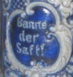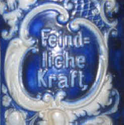 This sounds like a WCTU (Women's Christian Temperance Union) advertisement, but it doesn't look like anyone's paying attention on this blue/gray, salt-glazed, stoneware stein ca. 1900. | |