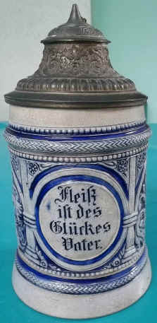 If you are persistent, luck will surely come your way is the motto on this blue/gray, salt-glazed, stoneware stein, ca. 1900. | |