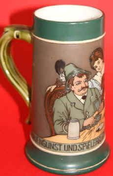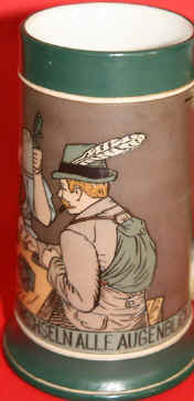 How many of us have experienced this? This etched stein (without lid) is marked with the Mettlach logo and mold number 3253 and dated 1908. | |