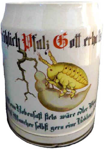 | The Rheinpfalz (Rhineland Palatinate) is a wine region in Germany and apparently when the wine turns out good, it makes the grape lice (phylloxera vastatrix) happy. The print under glaze (PUG) stein without lid is marked with the logo of Jacobi, Adler & Co. of Neuleiningen, ca. 1900. | |
