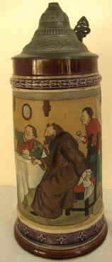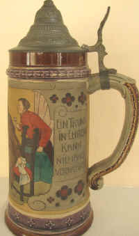 | Here are two good sayings on an etched stein marked "JWR 947 Germany" by J. W. Remy ca. 1900. Note the word "trei" = "drei" = "three" in English. The equivalence of "th", "t" and "d" are seen constantly within German and English cognates. | |