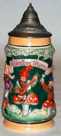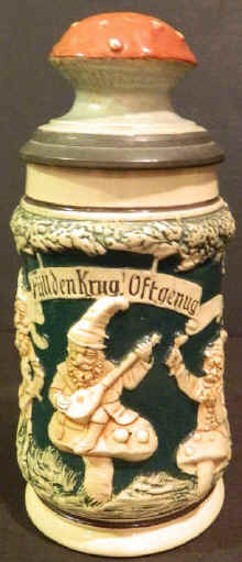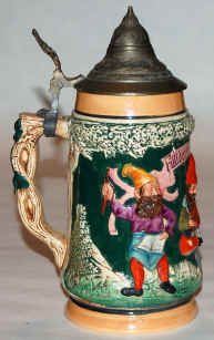 The message is clear on this relief stein with gnomes and a mushroom lid marked "Germany", ca. early 1900's. | |