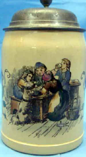 I wonder what the WCTU would have said about this verse. Germany never had to suffer a "Prohibition" like we did. This is a PUG (printed under glaze) stein attributed to Mettlach, but only marked with a Villeroy & Boch logo, mold # 1909, decor # 611, and dated 1890. | |