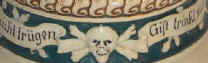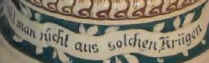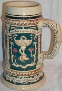 | This relief stein without lid was apparently given to visitors of the firm of Paulus & Thewalt that made stoneware articles for use in science laboratories and apothecaries. Paulus & Thewalt did not make beer steins. This one is marked with the logo of Albert Jacob Thewalt (see: Chris Wheeler's "Stein Marks"), mold number "242 F", "Musterschutz" (copyrighted) and dated 1902. For the translation of the verse on the lower rim, see the translation for "In mir ist Wahrheit....." . | |