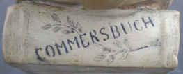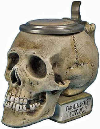 | These are the first two lines of a very famous student song often used at graduation commencements and at beer drinking events since the lyrics represent the lighter side of student life and the shortness of life in general. The language is Latin and the full song dates to the early 18th C. based on a Latin manuscript from 1287. The anatomically correct skull is resting on a Commersbuch (students' song book). This porcelain character stein is marked with the logo of Ernst Bohne & Söhne ca. 1900. | |