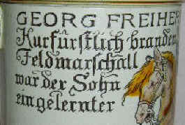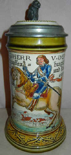 The biography of a famous German military hero, George Baron von Derfflinger, who came from a poor tailor's family and rose to the very important position of General Field Marshall of Brandenburg in the 17th century is the subject of this tailor's occupational stein which is mold number 2720 (dated 1901) in a series of twelve Mettlach occupational steins designed by Otto Hupp. The scene shows a likeness of von Derfflinger on horseback in his role of freeing the city of Rathenow in Brandenburg (the scene at the base with the Protestant Church of St.-Marien-Andreas is labeled Rathenow) from the Swedes. | |