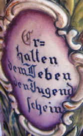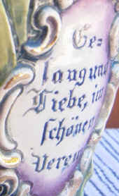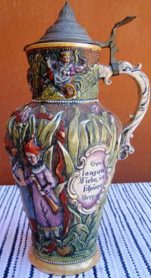 These lines are in a verse entitled "Die vier Weltalter" (the four periods of history) by Friedrich von Schiller 1802 and set to music in 1816 by Franz Schubert. The relief stein is marked with the German patent #154927 associated with Adolph Diesinger and "Germany 745" ca. 1900. | |