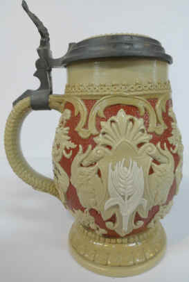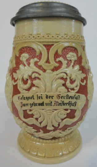 | Blessed be the beer that's made right is the theme on this relief stein marked with the Villeroy & Boch - Mettlach logo and form number 817 made in 1897. | |