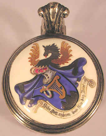 The verse seems to be Biblical, meaning to seek God's guidance and then carry out your tasks. The crest would appear to be for a musical society, but could also be a family arms. The color of the glass body of the stein is called "cranberry" and made with colloidal gold and the mounts are silver and marked "13" (16 lot = pure silver) meaning 13/16 = 800 or 80% silver (not plated silver), ca. mid 1800's. | |