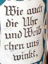 Happy is he who drinks his stein (of beer), Even when the clock and wife beckon. |