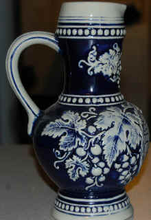 | It's very tempting to have some great wine from a cool stoneware ewer. This is one of the ways we got our word for (beer) stein. The relief ewer is marked with the Gerz logo and "W. Germany", ca. post WW II. | |