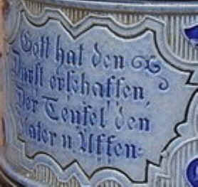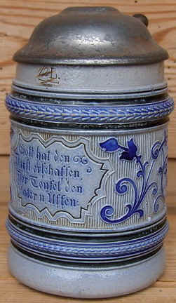 This is a take off on the Biblical creation story, but with different characters. The cats are the symbol of the hangover and the monkeys of drunkenness. The stein is blue/gray, salt-glazed, stoneware marked with the Reinhold Merkelbach logo and mold number 888 ca. 1900. | |