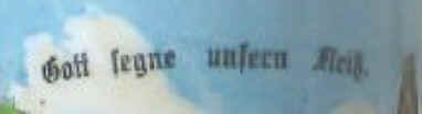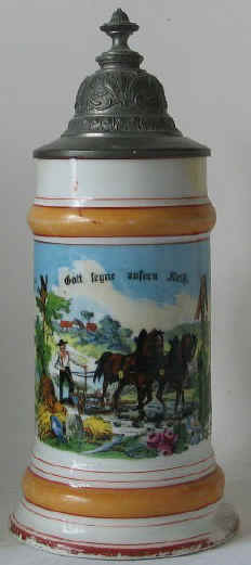 This is the theme on a Farmer's Occupational stein which asks for God's blessing on the farmer's industry and diligence. This is a porcelain stein with a lithophane (transparent scene in the bottom when held up to the light) ca. 1900. | |