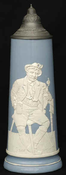 This is a very nice and unusual cameo style (similar to Wedgewood) stein with a verse in Bayrisch (Bavarian dialect) and marked with the Matthias Girmscheid logo and mold number 1861 ca. late 1800's. | |