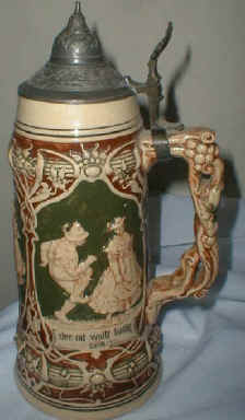 The general idea expressed on this stein is correct and rhymes in German, but is a little awkward in this English translation. This relief stein, ca. 1900, by Matthias Girmscheid is only marked "778". | |