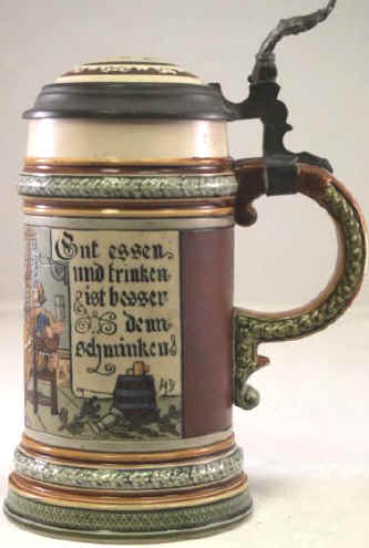 The meaning of this verse is that really good, down-to-earth food and drink are better than fancy dainties. This etched stein is marked with the Mettlach logo and mold number 2005 and dated 1909. | |