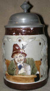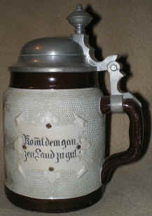 | This is a self explanatory verse on a porcelain, light-relief stein marked with the Hauber & Reuther logo and mold number 159, ca. 1900. | |