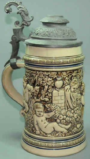 This seems to be an old saying meaning having something is better than nothing and make do with what you have. The stein is marked with the Merkelbach & Wick logo, ca. late 1800's. | |