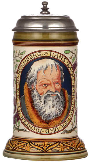 This is a shoemaker occupational, etched/glazed stein designed by Otto Hupp and marked with the Mettlach logo and mold number 2722 ca, 1900. Hans Sachs was used as the main feature because he was a shoemaker by trade and also a famous poet and promoter of Martin Luther. He was born in 1494, raised and died in 1576 in Nuremberg. | |