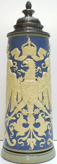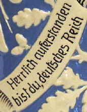 This is a very patriotic, relief and glazed stein commemorating the founding of the German Empire in 1871. The stein is marked with mold number 1744, ca. late 1800's, made by Reinhold Hanke. Verse is from poem/song by Julius Wolff. | |