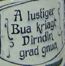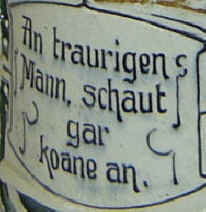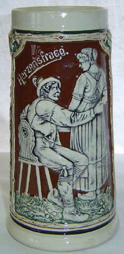 A question of the heart in dialect is the theme on this light relief stein ca. early 1900's. | |