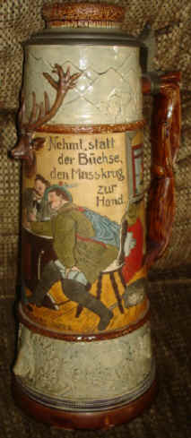 | From the scene it appears that the difficult choice was not whether to go hunting or drinking, but rather which of the two men the barmaid would choose. The large etched and relief stein is marked with the "TP" logo of Johann Peter Thewalt and "Germany 1433" ca. 1900. | |