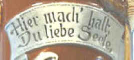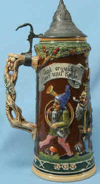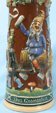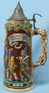 | Just a nice beer drinking motto with gnomes entitiled "Das Gnomenfest" (The Gnome Festival). The base impressed "Germany 1046" and signed "KB" on the body. The stein was probably made by Matthias Girmscheid and designed by Karl Beuler ca. 1900. | |