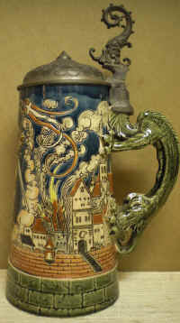 | St. Florian is the patron saint of firemen, but here he's being called to help quench the second version of a fire, i.e., a dry throat. This is a 1 L. version of the Mettlach stein with mold number 1786 designed by Otto Hupp and made about 1900. This stein is usually seen with a ceramic "dragon head" thumblift. | |