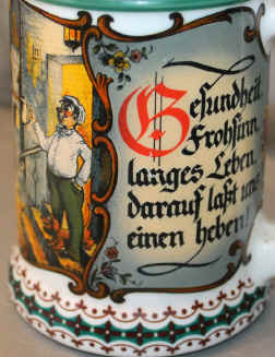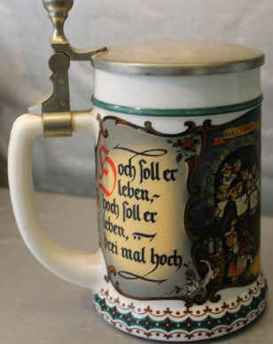 | Here's a toast to begin the drinking on this porcelain stein with a transfer scene, ca. late 1900's to early 2000's. Hoch (high) is translated here as "long" to correspond to the English equivalent "long live". | |