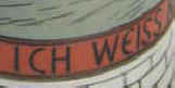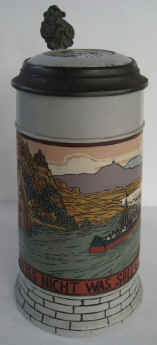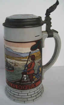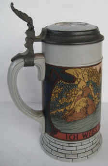 | This stein is one in a seriesof Mettlach steins representing German folk songs and legends called the "Brick Wall" series for obvious reasons and numbered 2833. This one is 2833 C and has a scene of the famous "Lorelei" (murmuring rock) on the Rhein. The myth of a forlorn but beautiful woman that died here was written about and put to song in the 19th century and it is said that she lured many boats with there crews to their demise at this point. Only the first line of the song is on the stein, but the entire first stanza is included for completion. | |