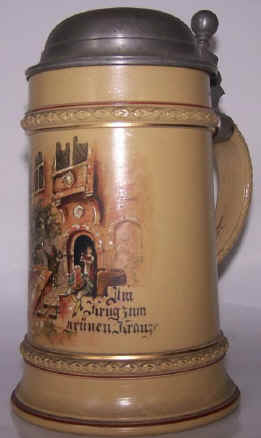 | The first line of a song by Wilhelm Müller (1794 - 1827) is written on this stein marked "VB" (Villeroy and Boch) and mold number 406 dated 1894. The whole first stanza is included for completeness. The "Krug zum Grünen Kranze" is the name of a tavern. | |