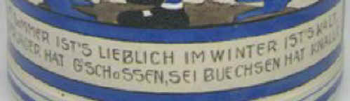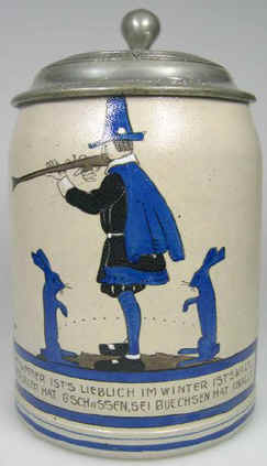 This might be funny in German, but it loses something in translation or maybe it's just me. The salt-glazed, stoneware, Jugendstil (youth style = modern art) stein was designed by Ludwig Hohlwein, ca. early 1900's. | |