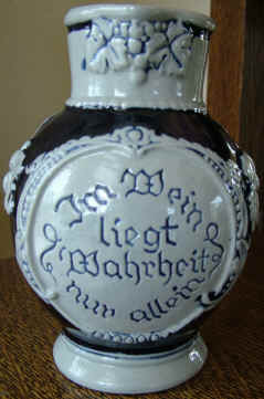 | This verse probably means that if one drinks enough wine, one's inhibitions will be lost and the truth is more likely to come out. The wine/beer pitcher is marked "Western Germany", ca. after WW II. | |