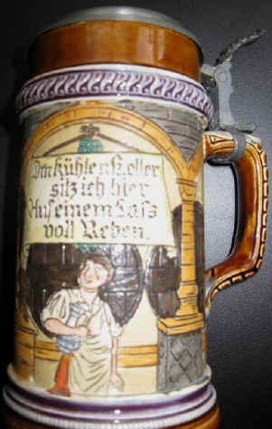 The first two lines of a German student drinking song appear on this etched stein by J. W. Remy marked "1295 Germany" ca. 1900. | |