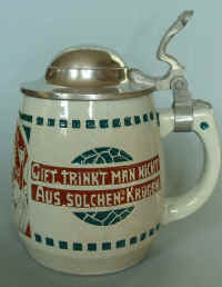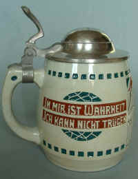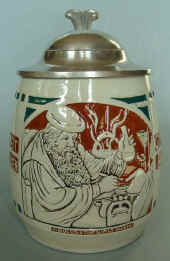 | The scene on the front clearly depicts an alchemist in his laboratory (The Thewalt Catalog calls this "the Studying Pharmacist".) and suggests that this could be an occupational stein for a chemist or an apothecary. The verse is a satire indicating that since science is based on truth, one will not be exposed to poison by drinking from such a stein. It is marked on the front "Paulus & Thewalt Hoehr" and impressed on the bottom is the trade mark of Albert Jacob Thewalt, Germany and the number 536, ca. early 1900's. | |