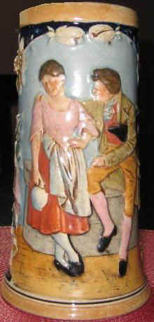 | To have a beautiful young lady with two dark eyes and full red lips at one's side is lucky indeed. The relief stein without lid is marked with the J. W. Remy logo, Germany and model number 826, ca. 1900. | |